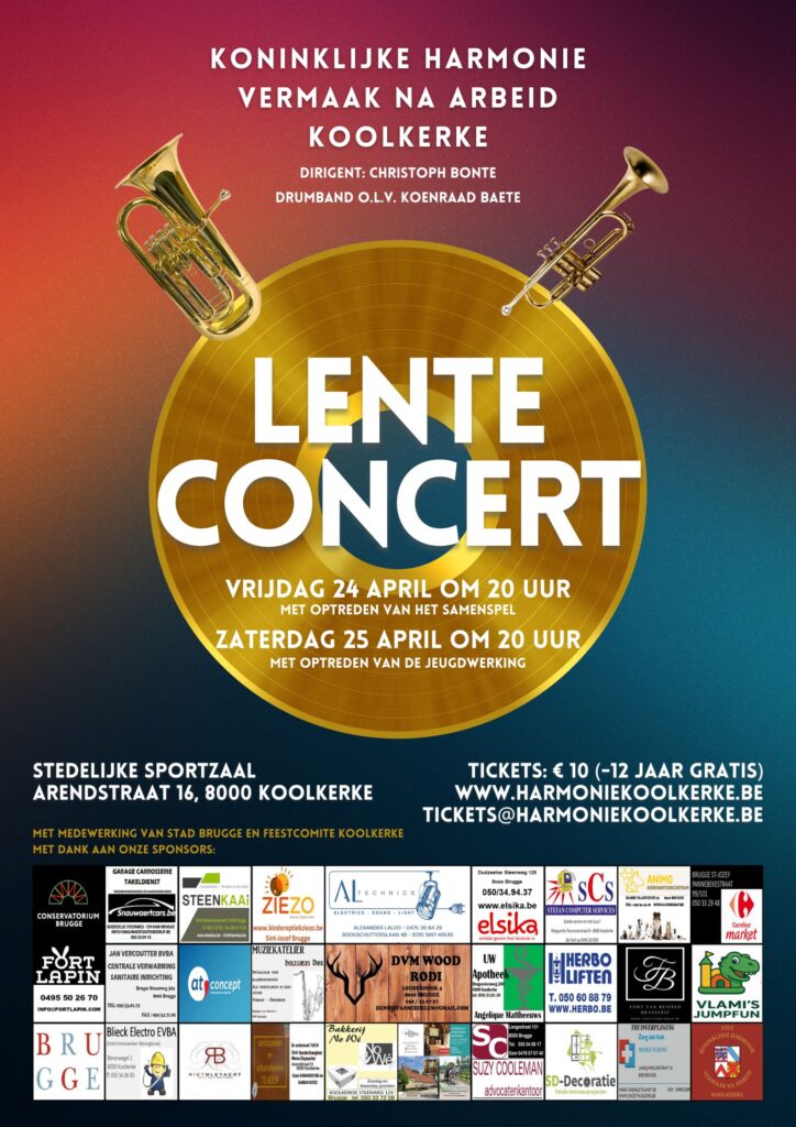 Op vrijdag 24 en zaterdag 25 april 2026 geven wij een heus Lenteconcert onder leiding van Christoph Bonte en Koenraad Baete. Op vrijdag zal ook het samenspel optreden en de zaterdag zullen de leerlingen van de notenleerklas en trommelklas het beste van zichzelf geven.
